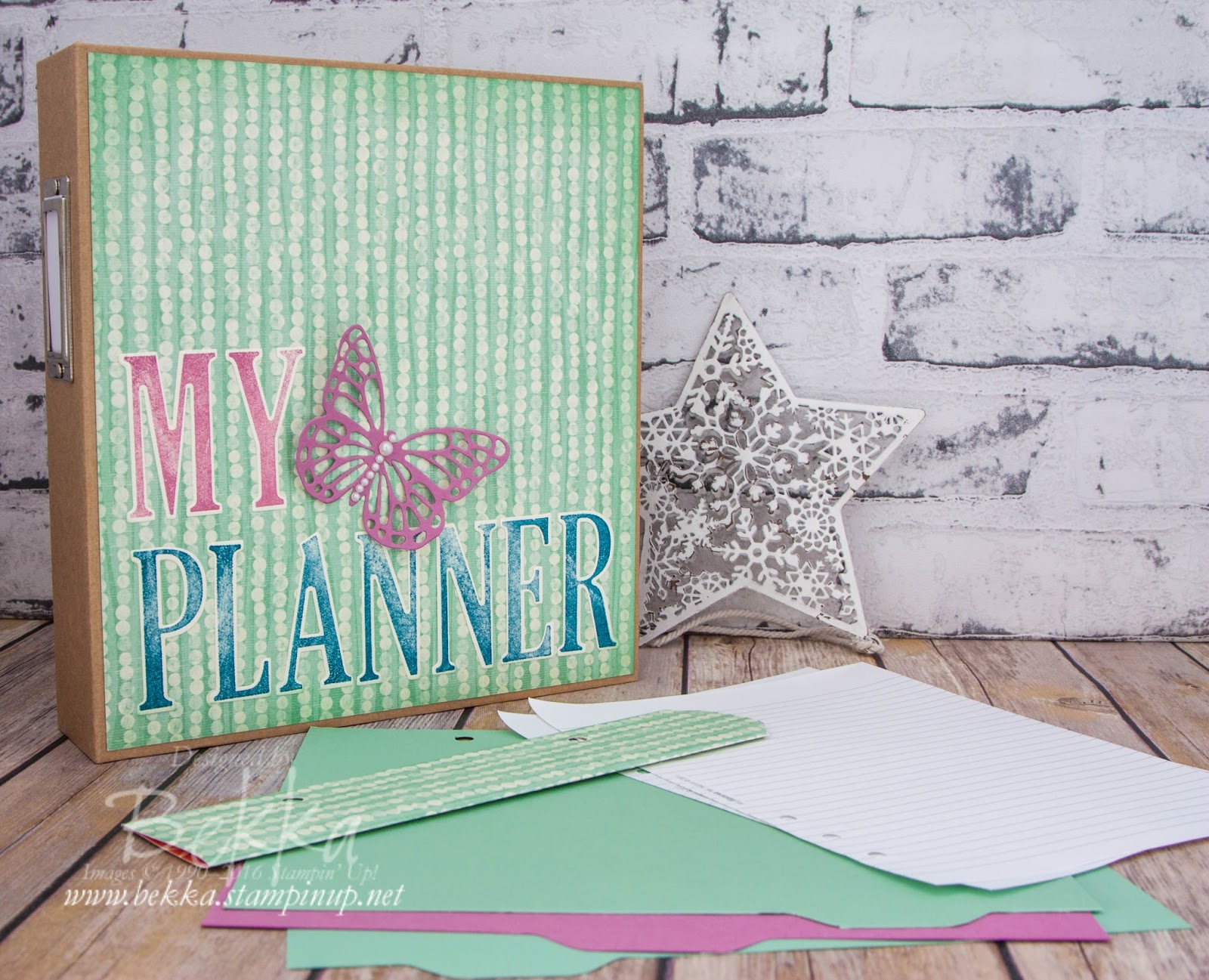 The basis of the planner is a Kraft 6x8 inch Project Life Album which you can purchase here. I have decorated the front using a piece of patterned paper measuring 8 1/4 x 8 1/2 inches (21 x 21.5 cm). I inked the edges and decorated it with my chosen letters before sticking it to the album cover.